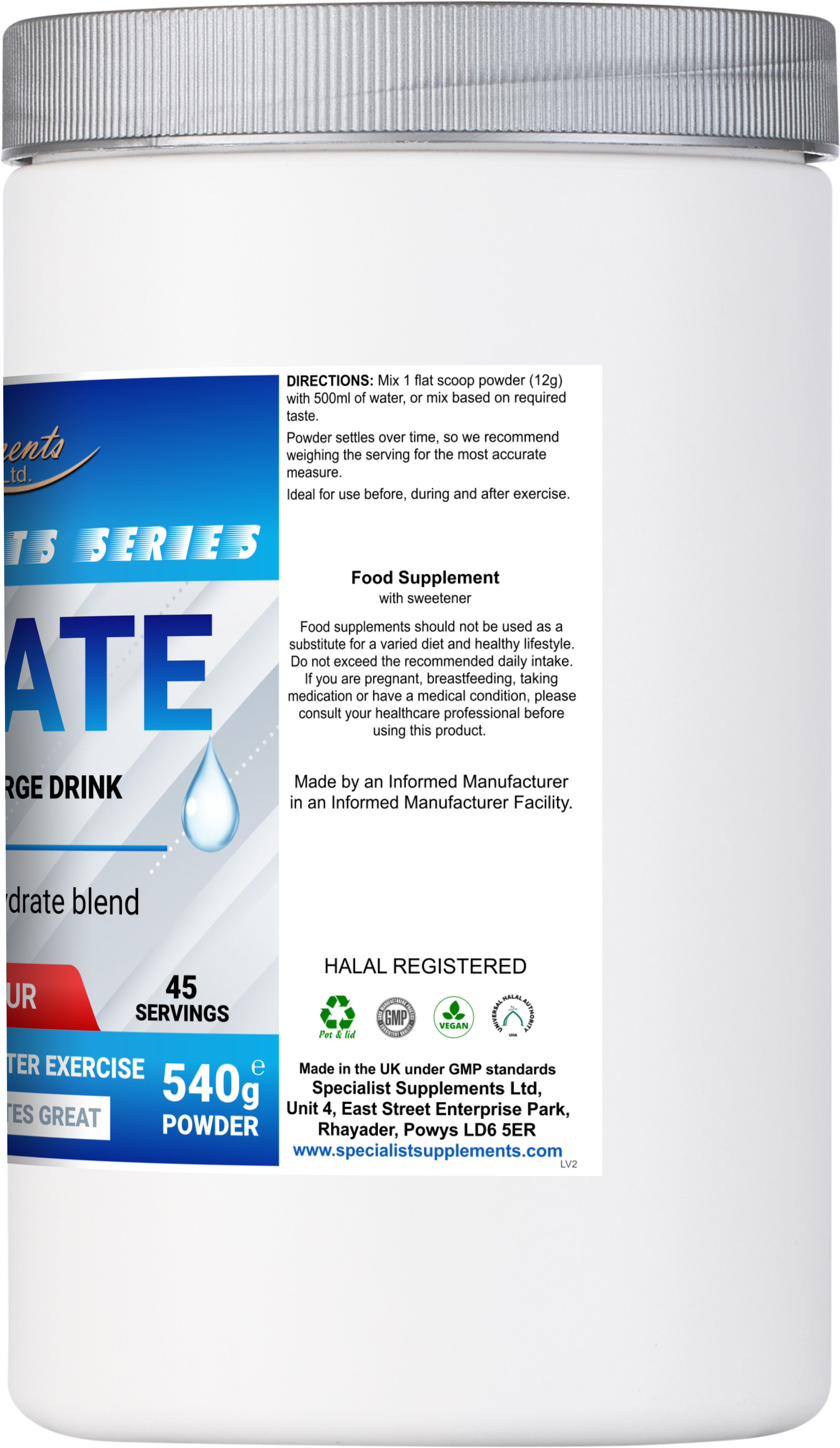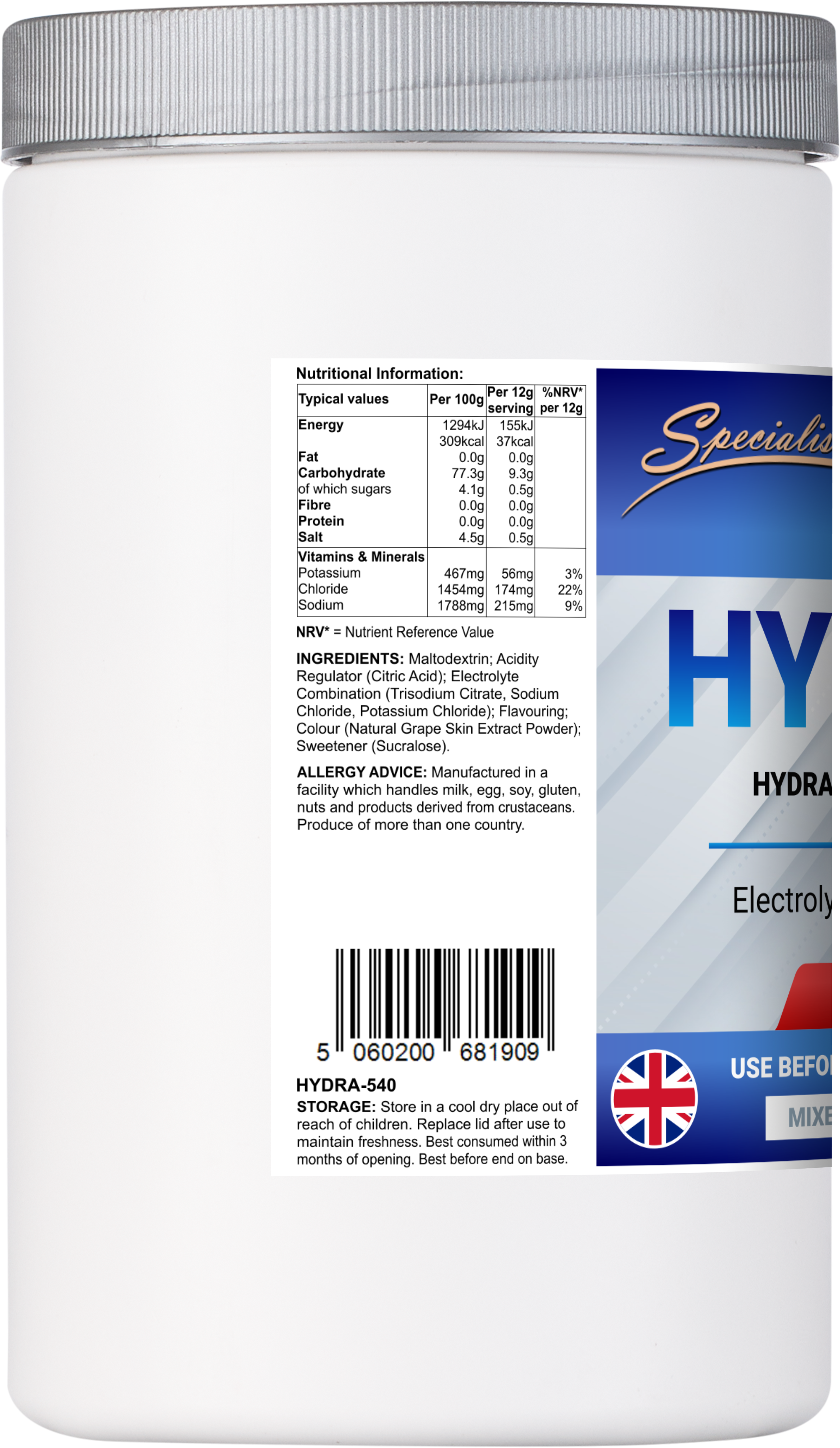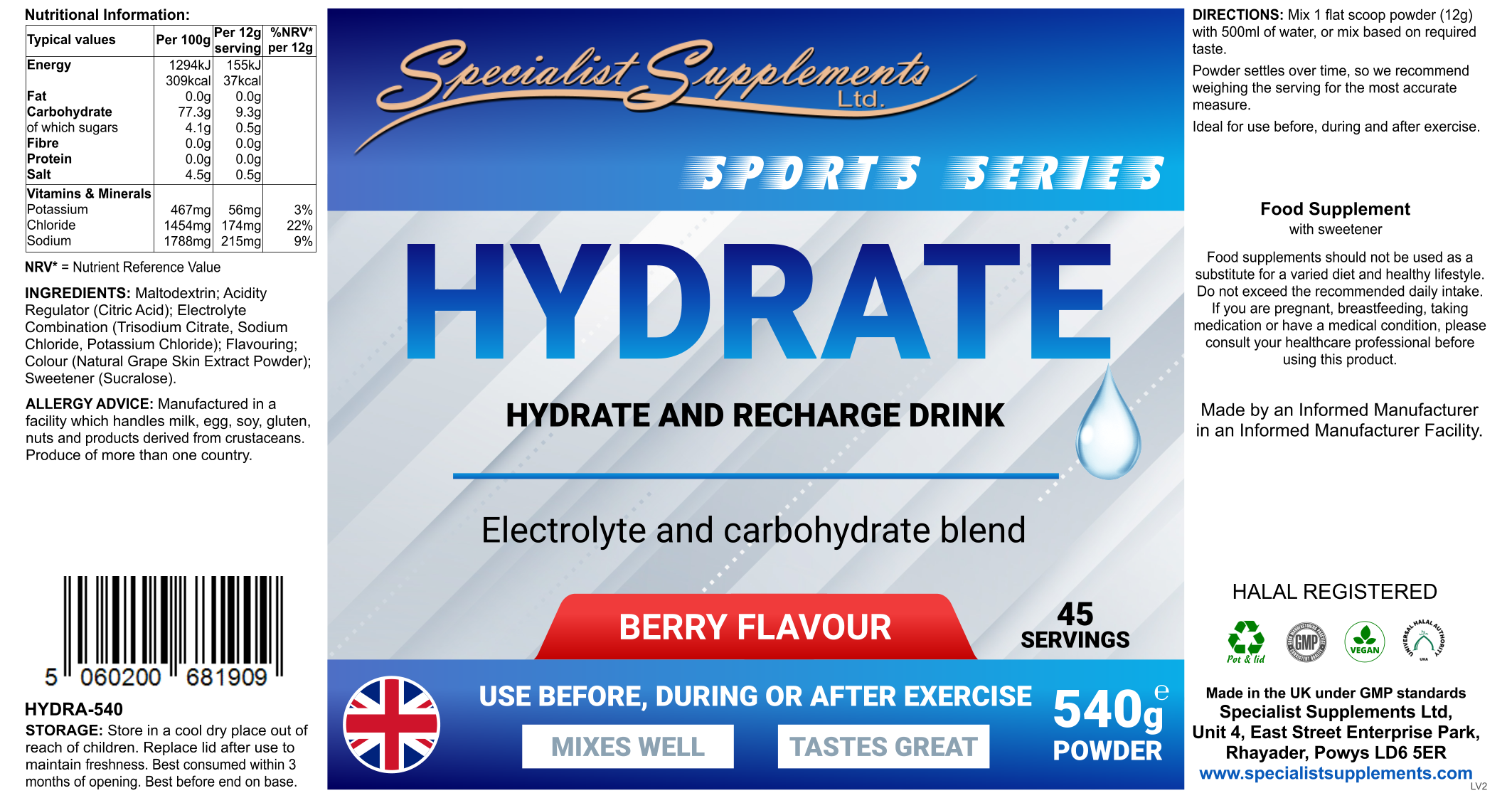 540g powder (berry flavour): Part of our Sports Series, Hydrate is a delicious drink mix, which contains an electrolyte and carbohydrate blend designed for rapid hydration.